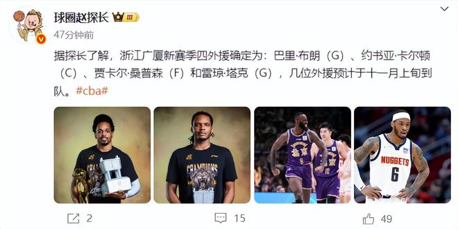 據媒體人“趙探長”報道,浙江廣廈俱樂部四名外援全部確定下來了,廣廈已經與他們達成了簽約,這四名外援分別是巴里-布朗、約書亞-卡爾頓、賈卡爾-桑普森、雷瓊-塔克,預計11月中旬可以與廣廈會合。